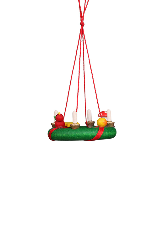 Diesen wunderschönen Adventskranz zum Hängen schmücken 4 Kerzen. Zwischen ihnen ist der Kranz mit reichlich Spielzeug geschmückt.