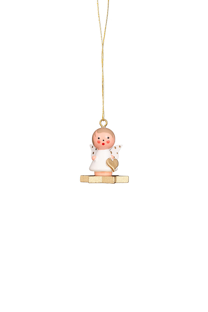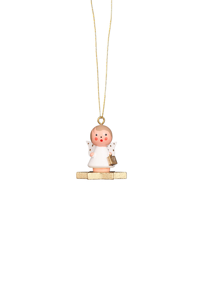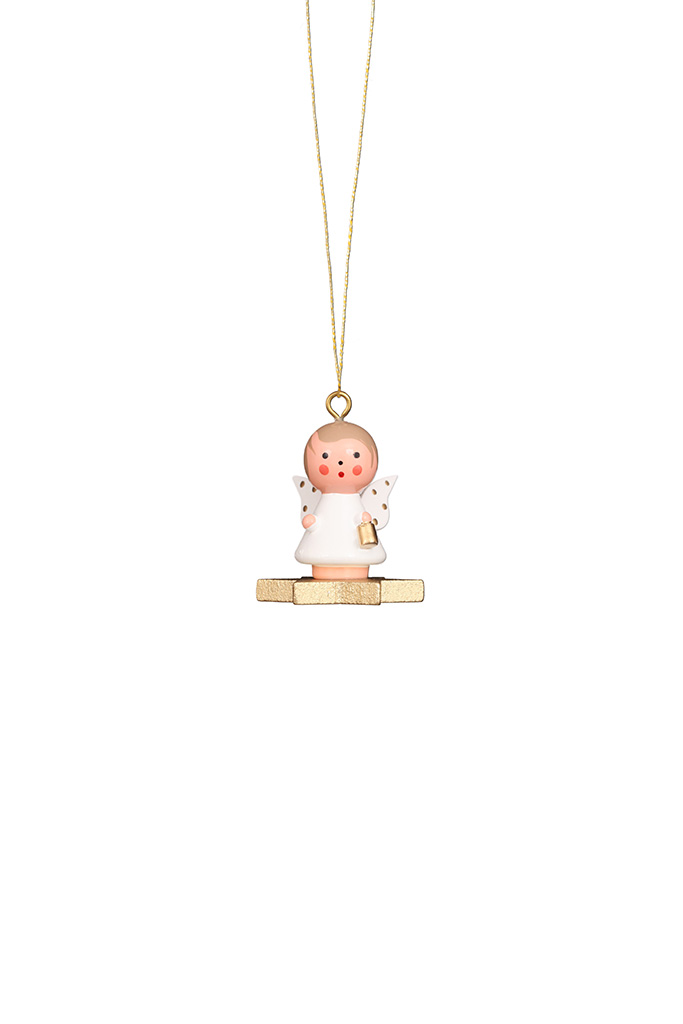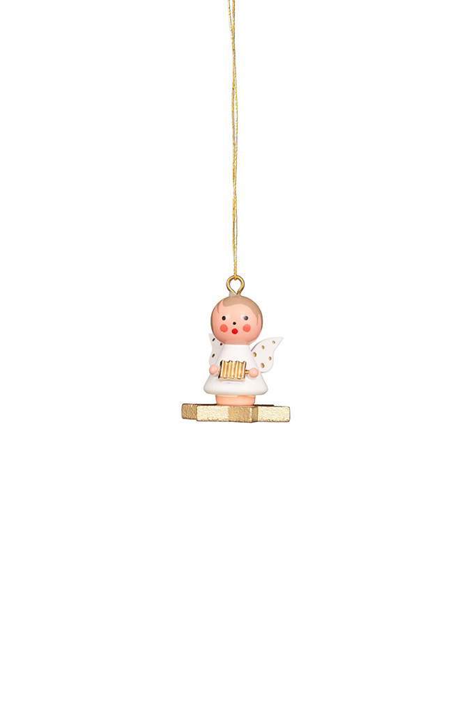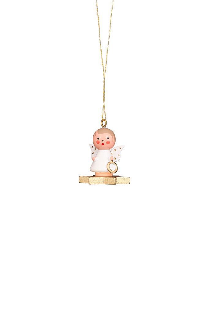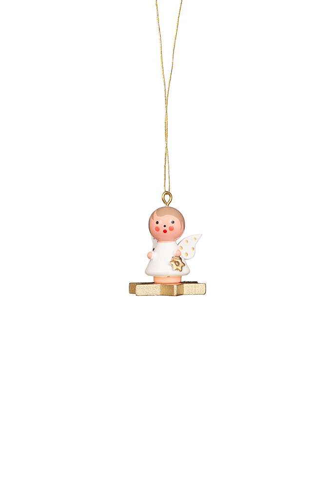Auf einem goldenen Stern steht der kleine Engel mit einem Geschenk in der Hand.