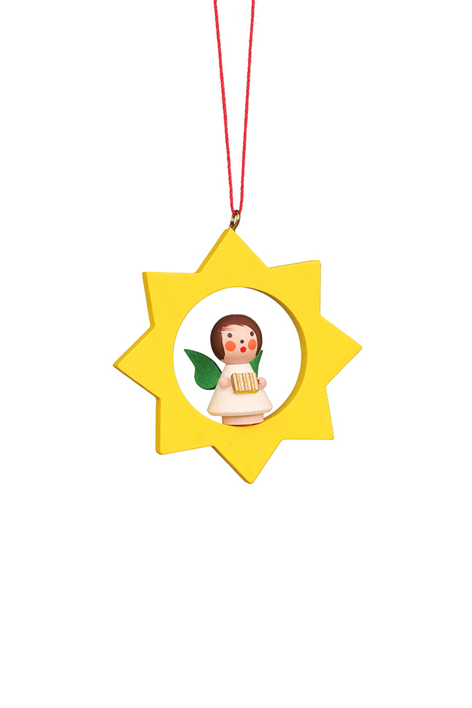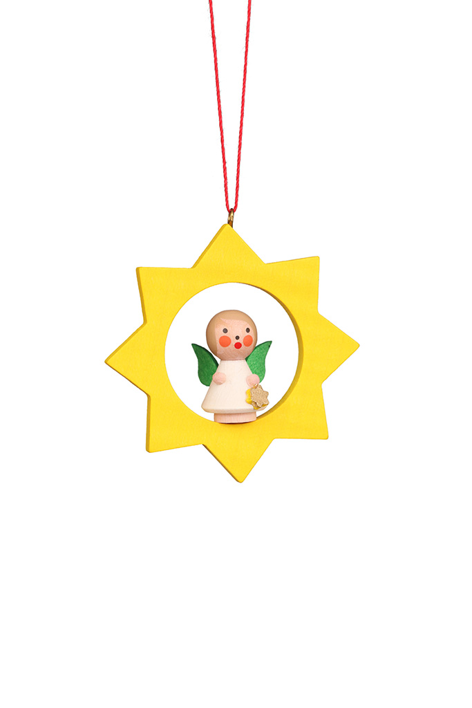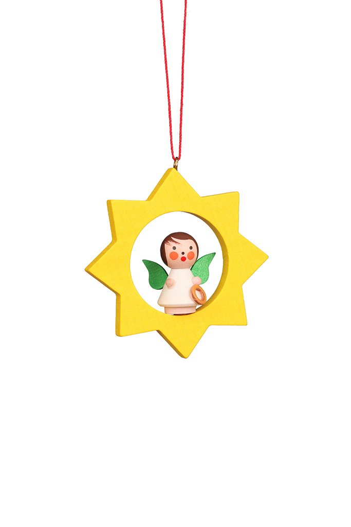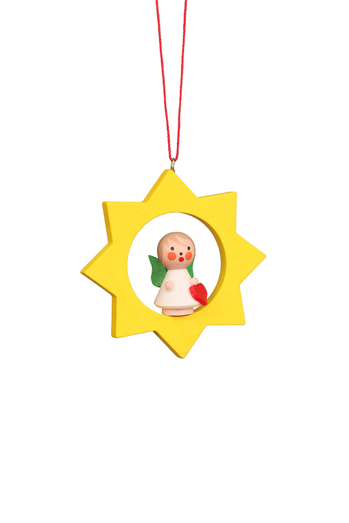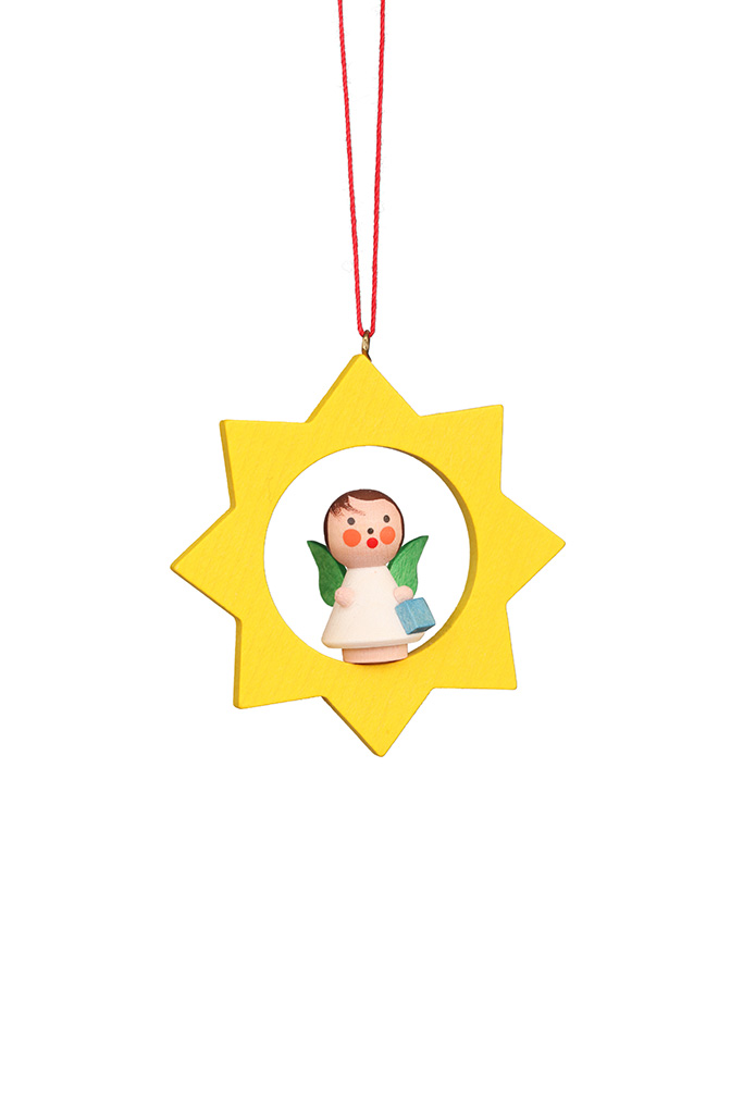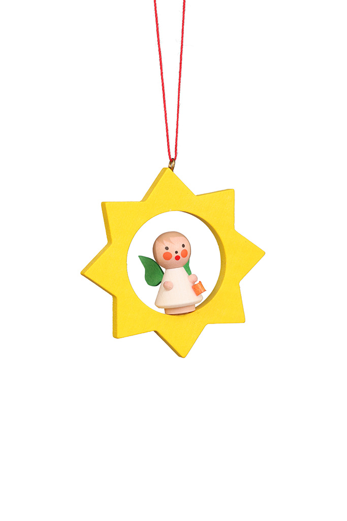 In einem gelben Stern hat ein kleines weißes Engelchen Platz genommen. In seiner kleinen Hand hält es ein kleines Geschenk.