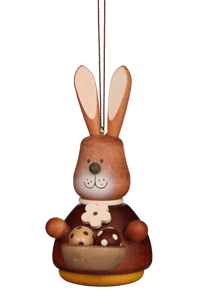 Ein Nest mit bemalten Eiern bringt uns dieser naturfarbene Wackelhase. Sein Kleidchen hat er festlich mit einer Blüte geschmückt.