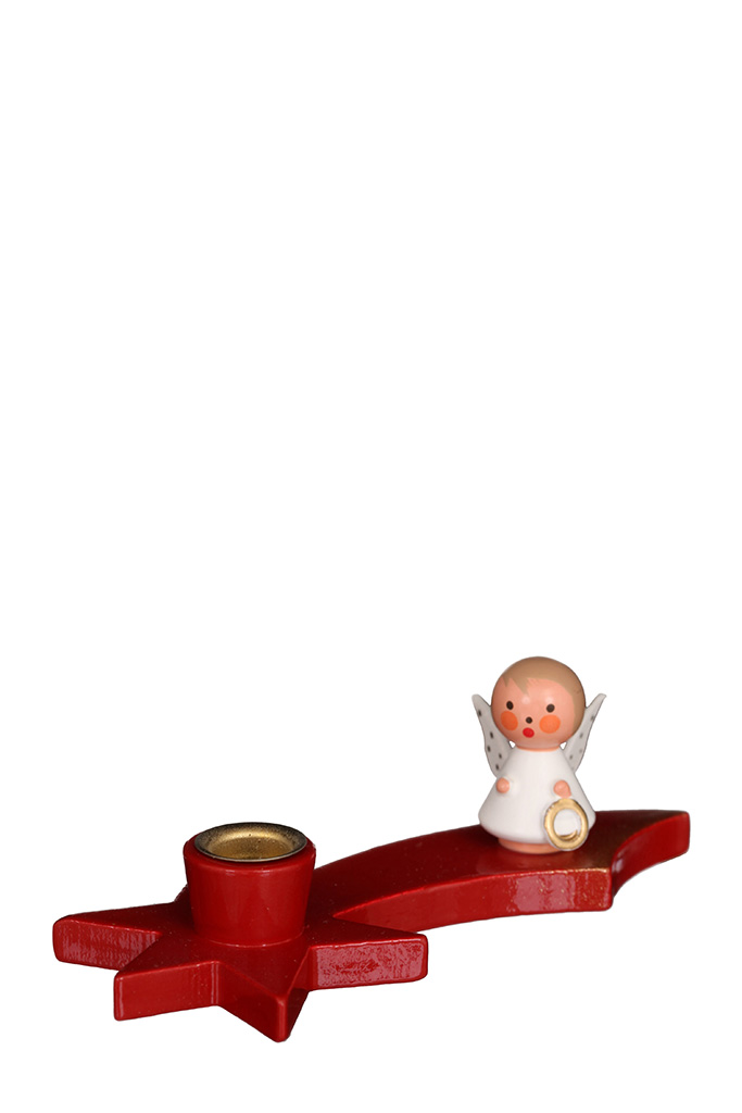 Der rote Kerzenhalter Komet hat auf seinem Schweif ein kleines weiß-goldenes Engelchen sitzen.