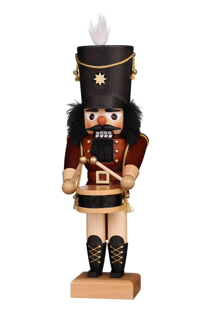 In vorderster Reihe marschierend schwingt der naturfarbene Nussknacker "Trommler" seine Schlägel. Stolz blickt er unter der großen federverzierten Kappe hervor.