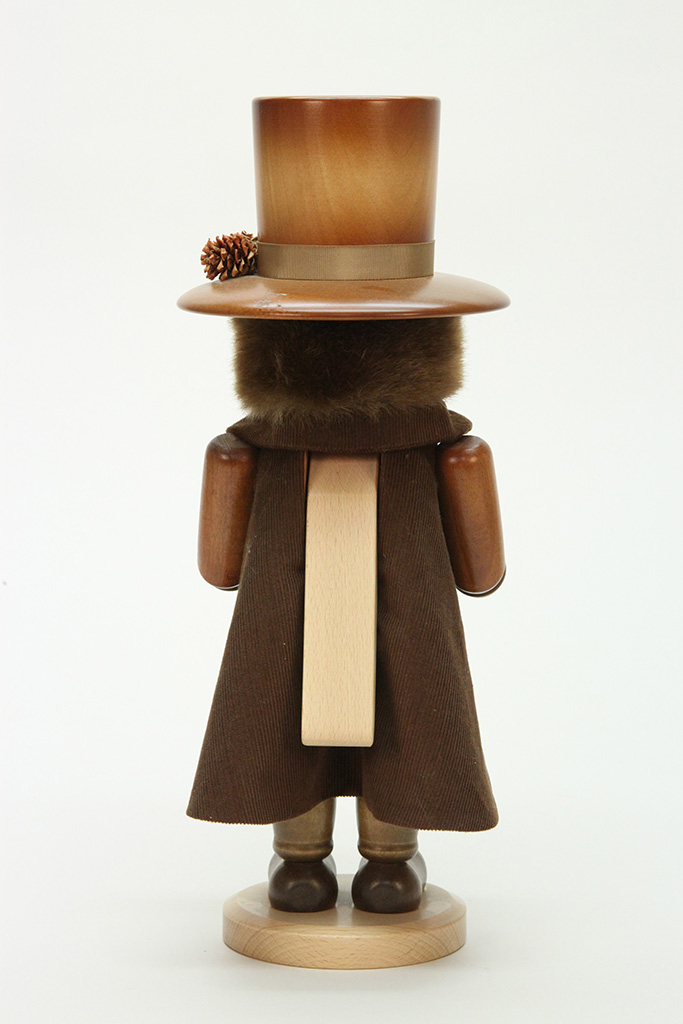 Voller Stolz präsentiert der Uhrmacher sein Meisterwerk, eine kunstvoll beschnitzte Kuckucksuhr.