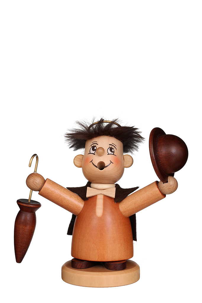 Am großen Heiligenschein erkennt man den braven Engel Arthur. Er ist auf dem Weg zur Erde, um den Menschen zu helfen. Freundlich winkt er mit seinem Hut.